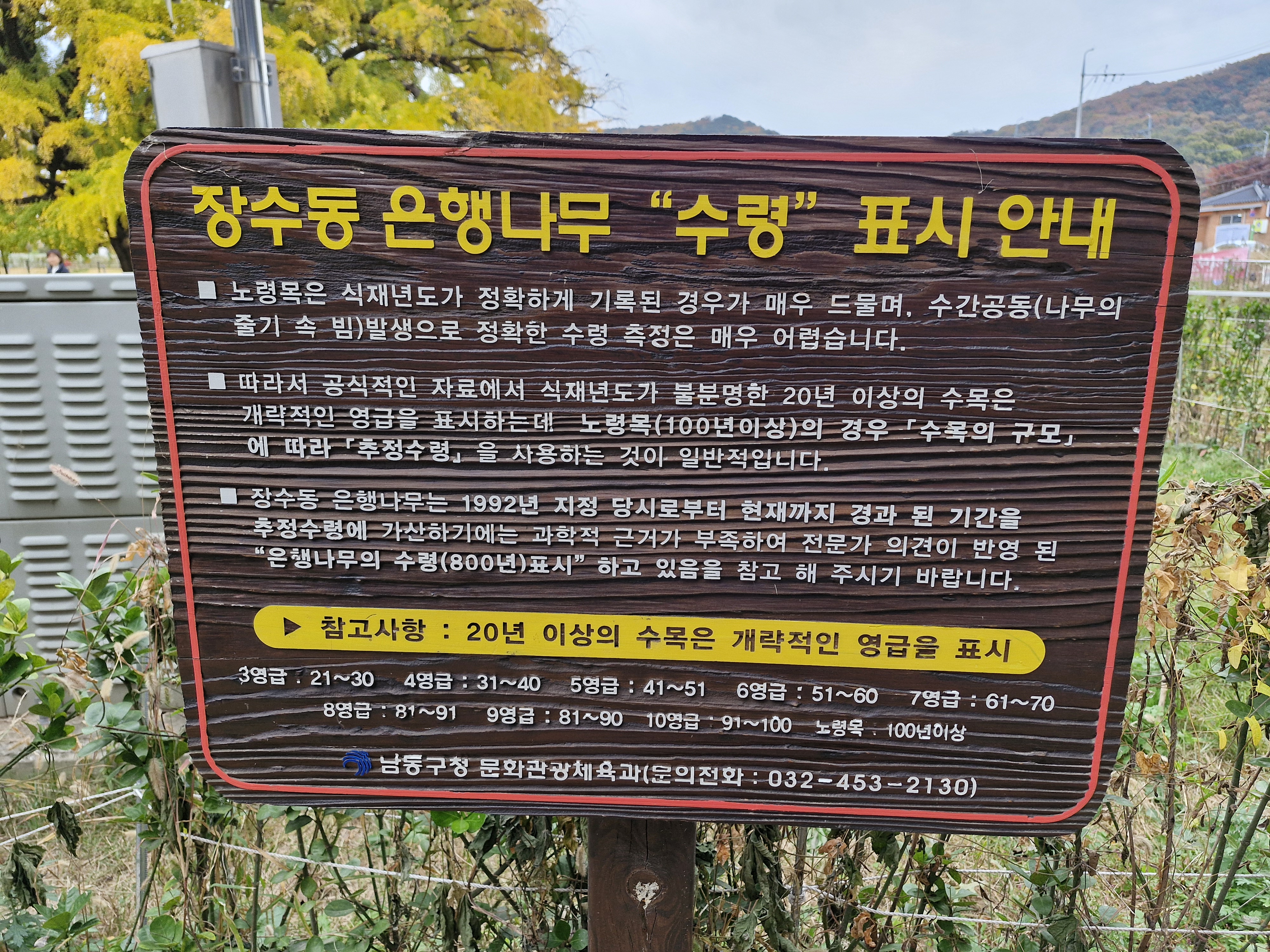 천연기념물 562호 인천 장수동 은행나무의 수령은 800년 정도로 추정되고 있습니다.