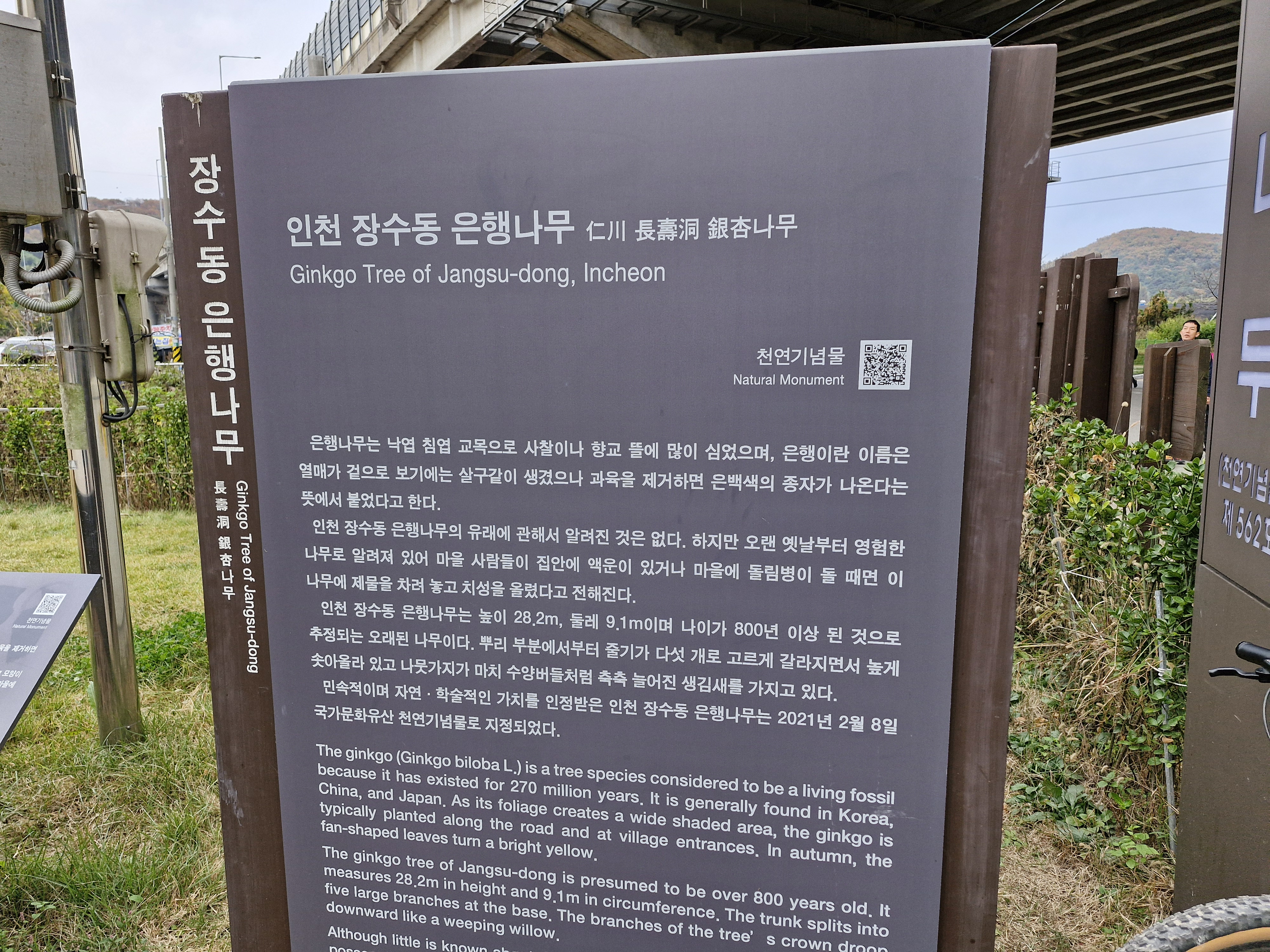 인천 장수동 은행나무라는 명칭으로 대한민국 천연기념물 제562호로 승격 지정되었다.