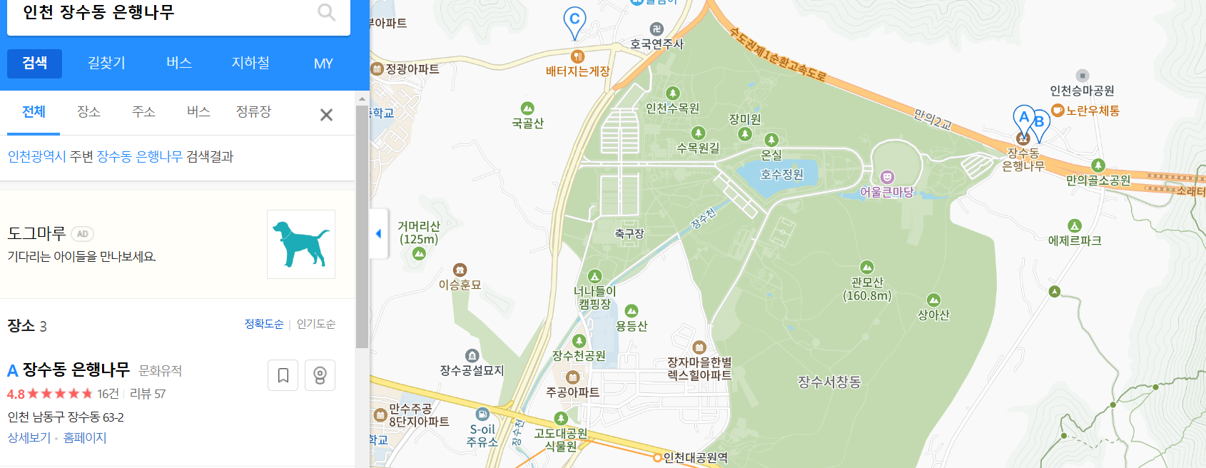 또한 인천대공원 동문 앞에 있는 인천 장수동 은행나무도 가을이면 노란 단풍잎이 장관입니다.