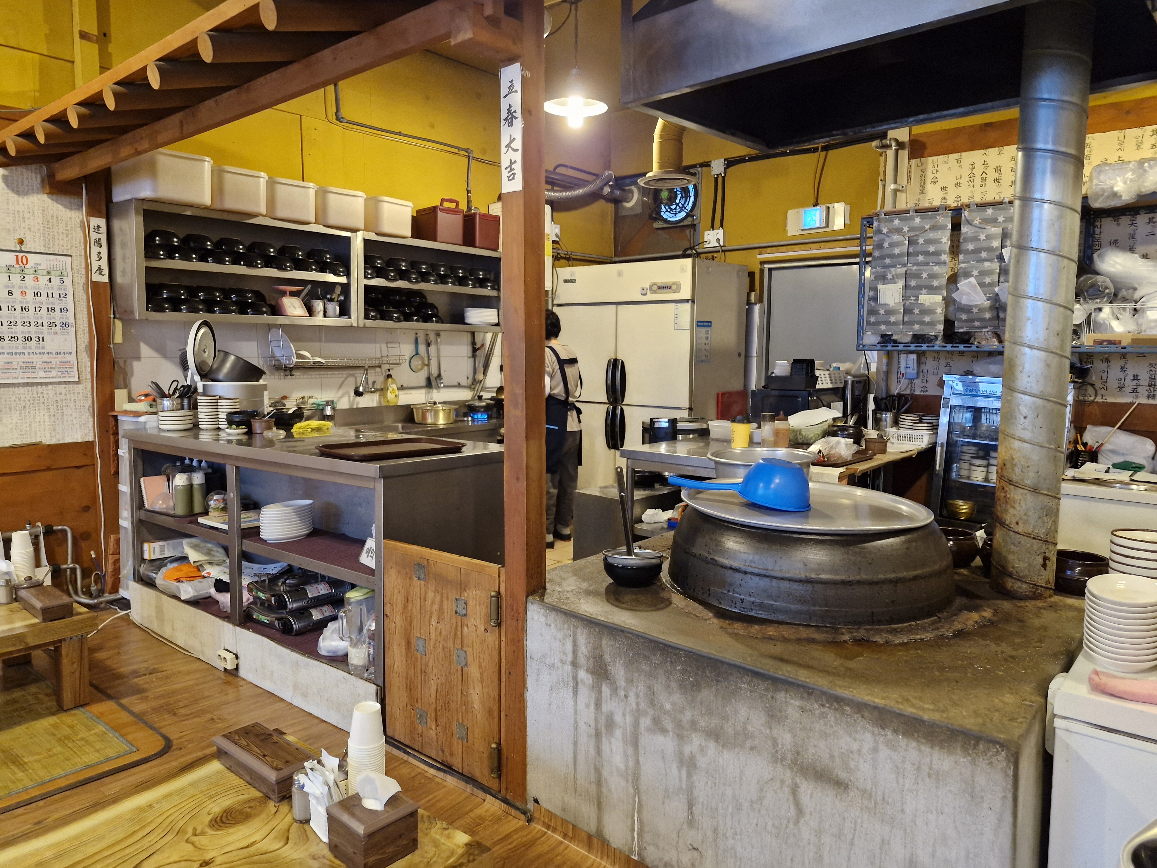 주방에 걸려 있는 대형 가마솥이 이 집에 대한 신뢰를 높여 줍니다.