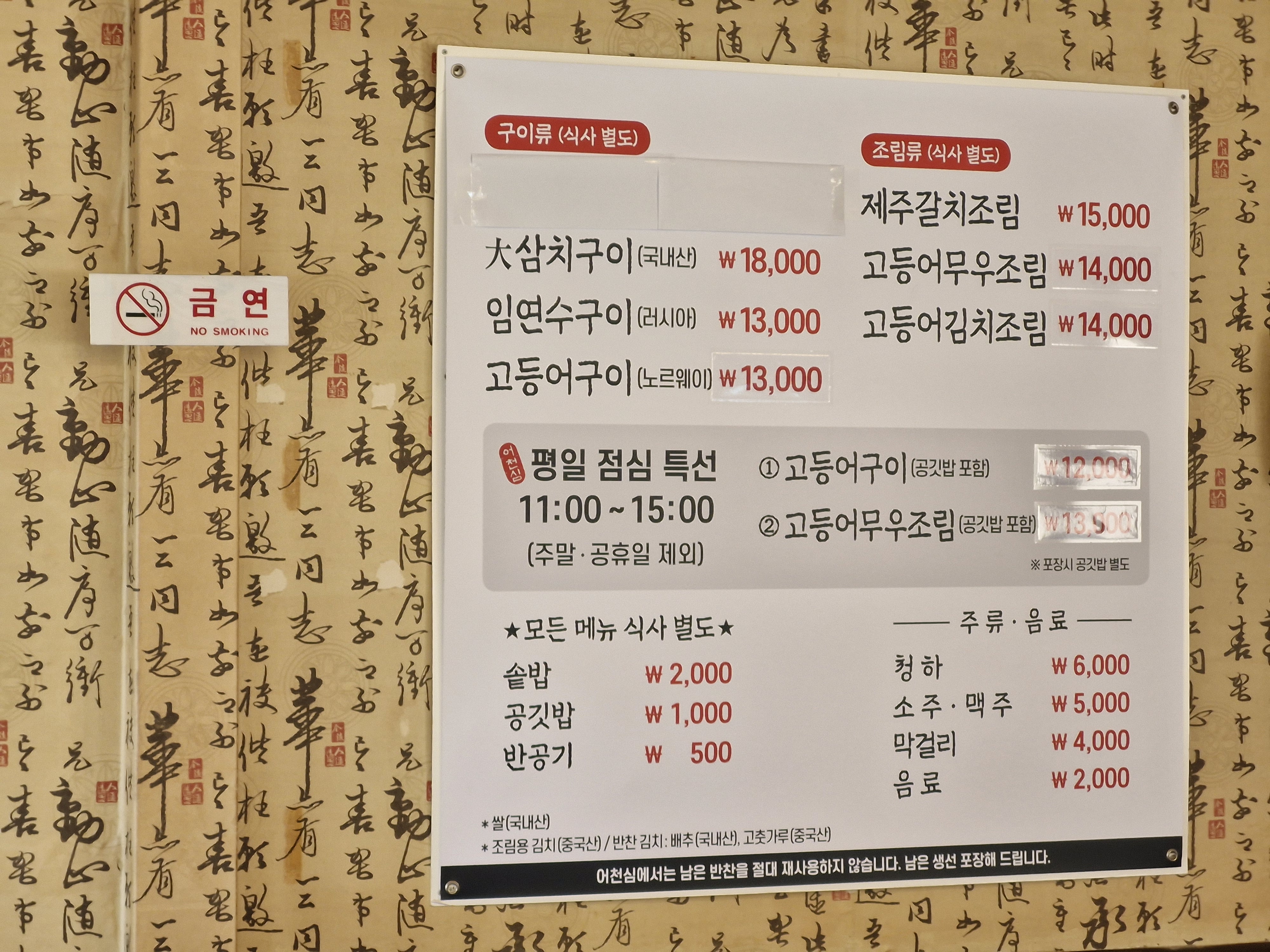 모든 품목이 1인분 씩 주문이 가능해서 둘이 와서 갈치조림 1인분, 생선구이 1인분 주문이 가능합니다.