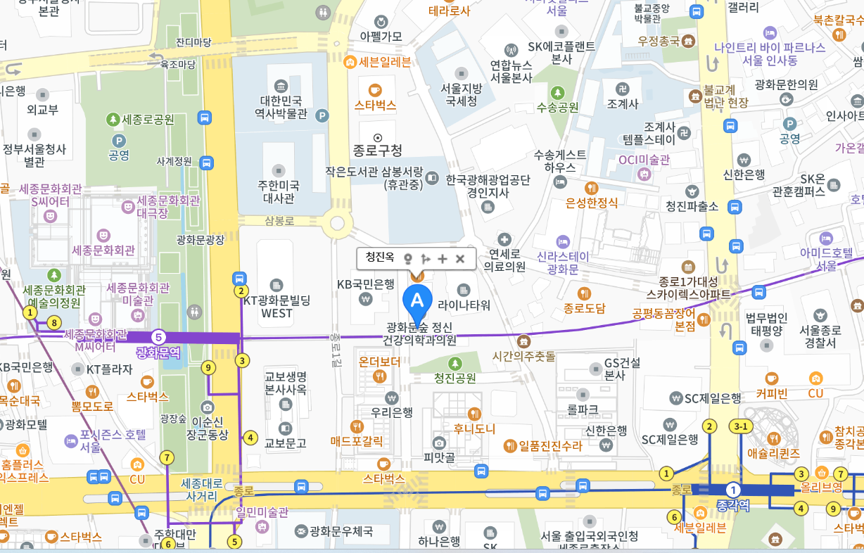 종로구청 가는 길, 청진공원 인근으로 광화문역이나 종각역에서 도보 5분 이내 거리입니다.