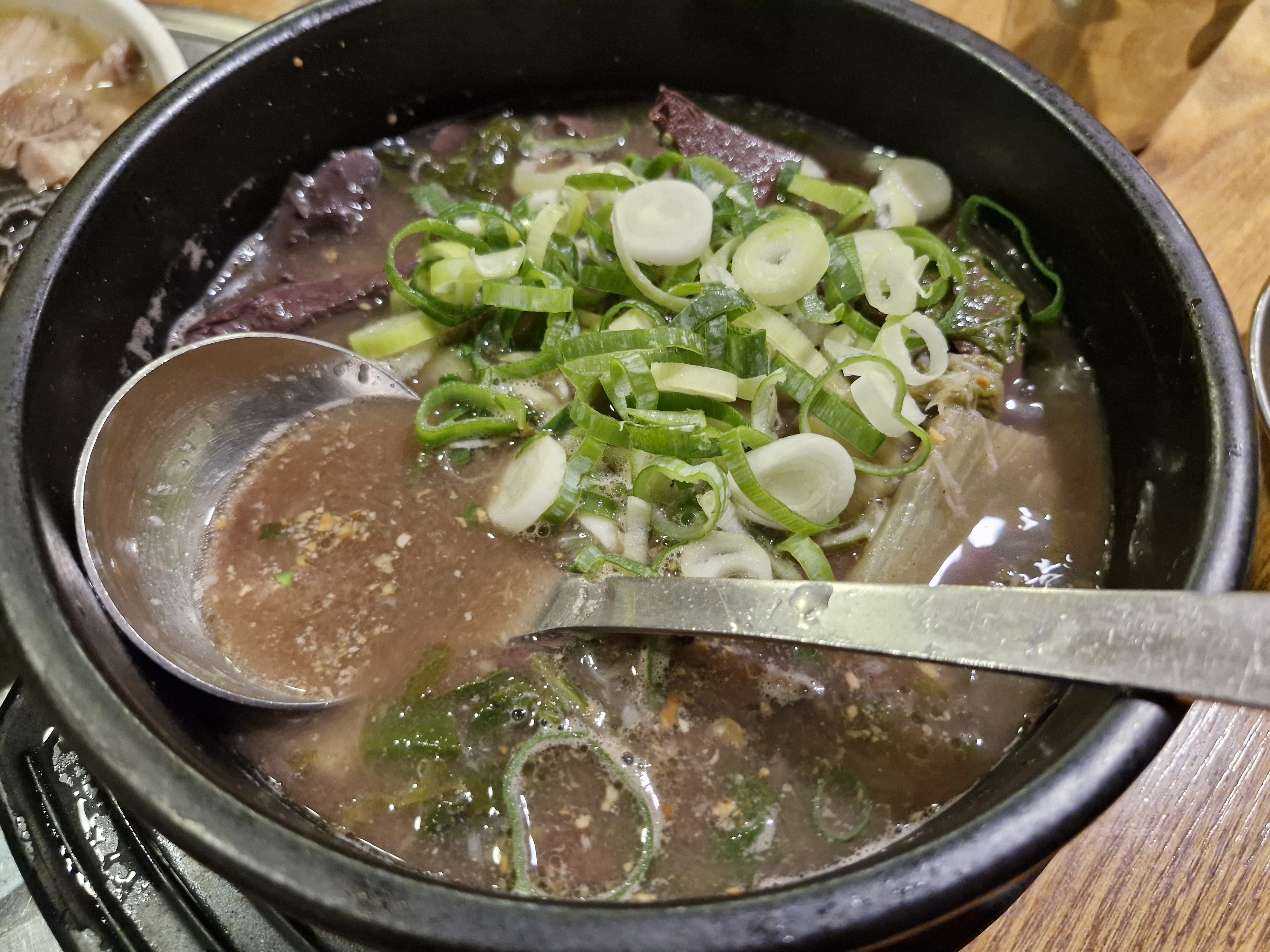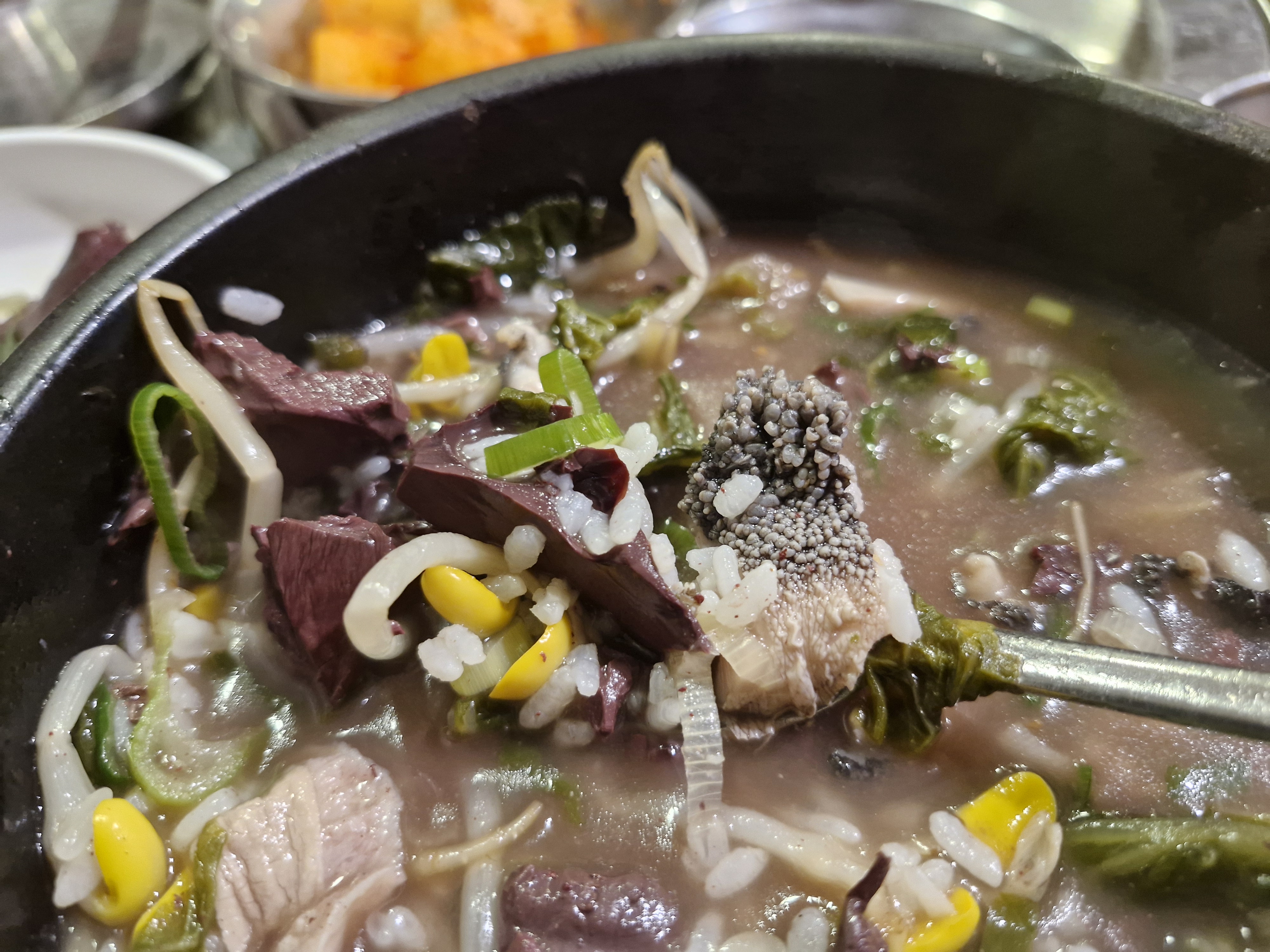 거기에 선지가 듬뿍 들어간 리필 가능한 해장국 국물이 함께 나오는데 해장국은 굳이 안 시켜도 될걸 그랬습니다 ㅎㅎㅎ