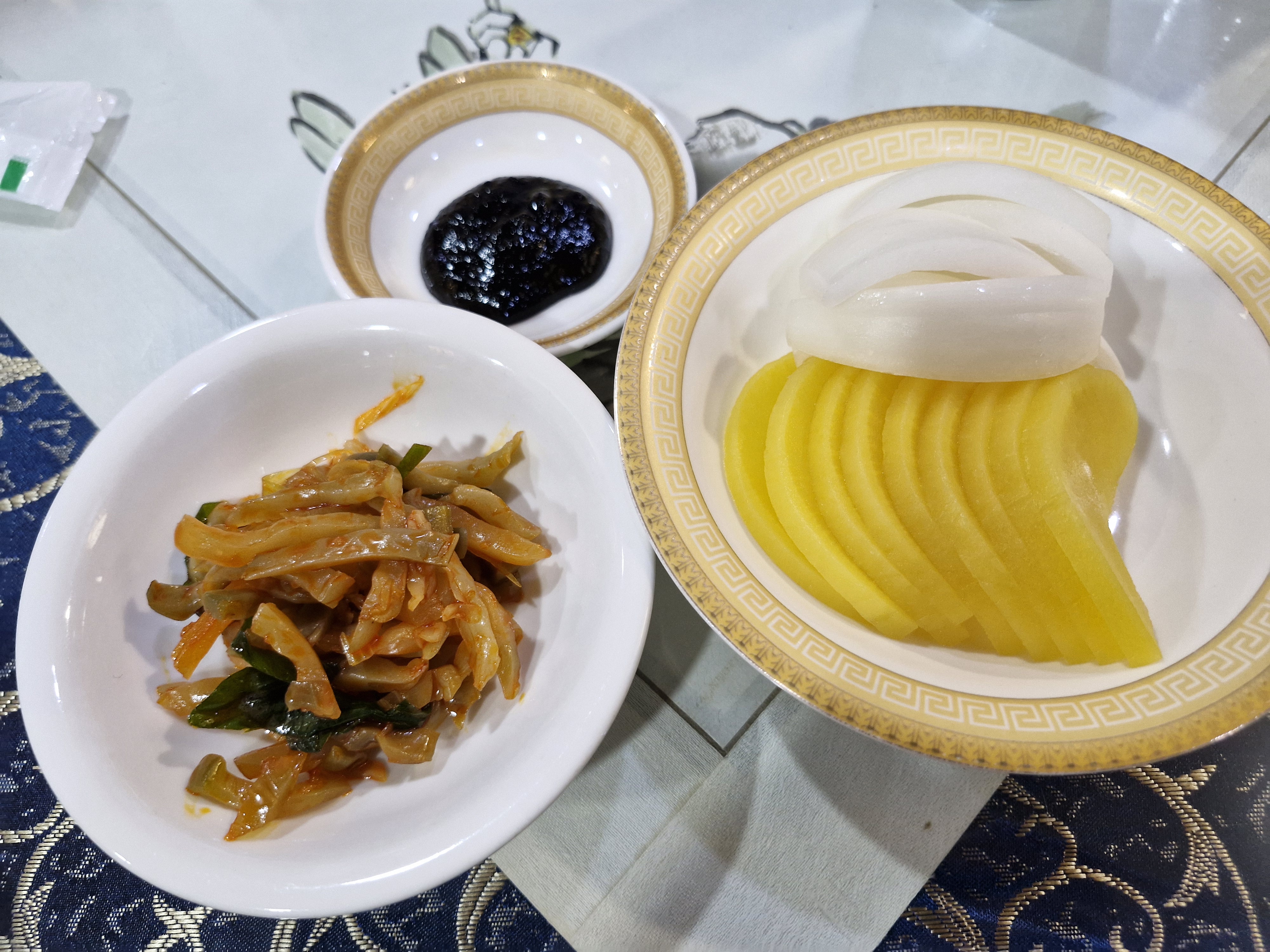 단무지, 양파, 자차이가 기본 반찬으로 나오고 식전에 입안을 향긋하게 만들어 줄 쟈스민차도 나옵니다.