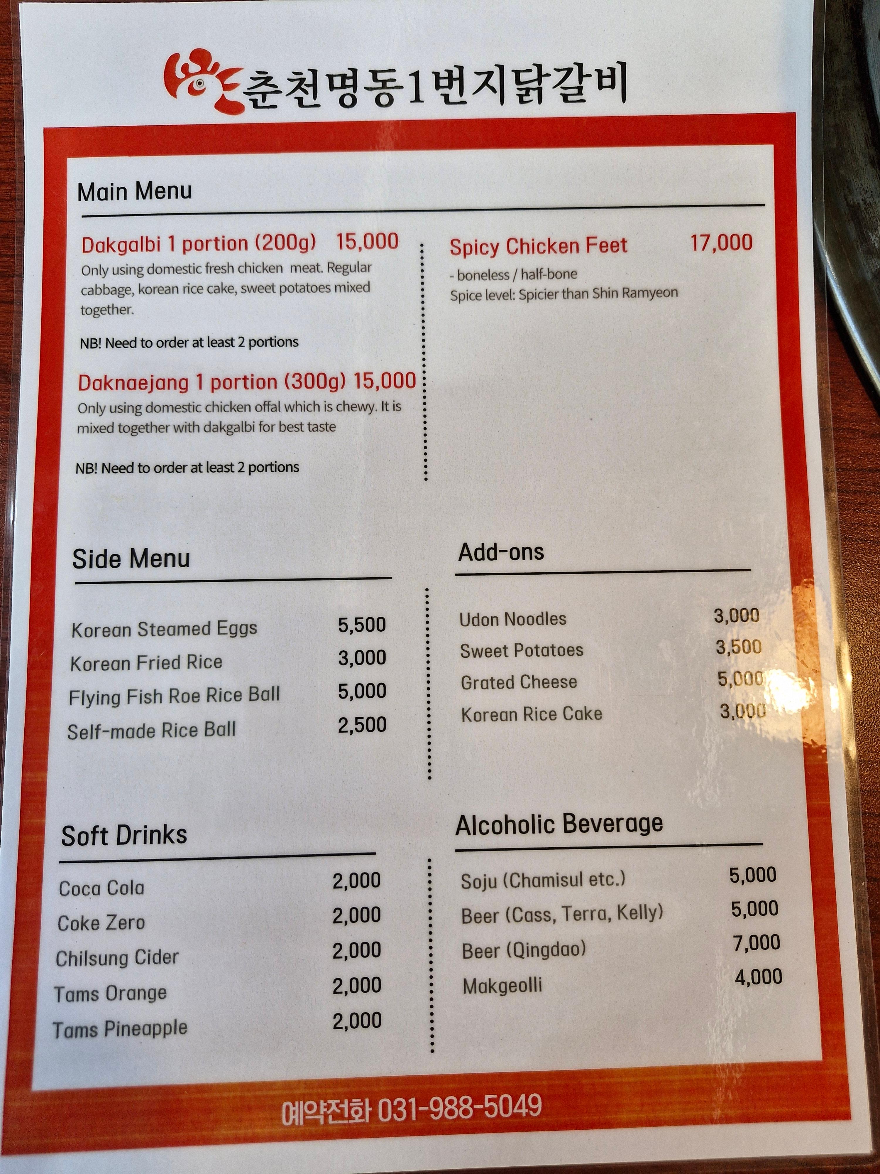 메인은 닭갈비, 닭내장, 불닭발 등 닭고기뿐이고 그 외에 사이드 메뉴와 주류, 음료수가 있습니다.