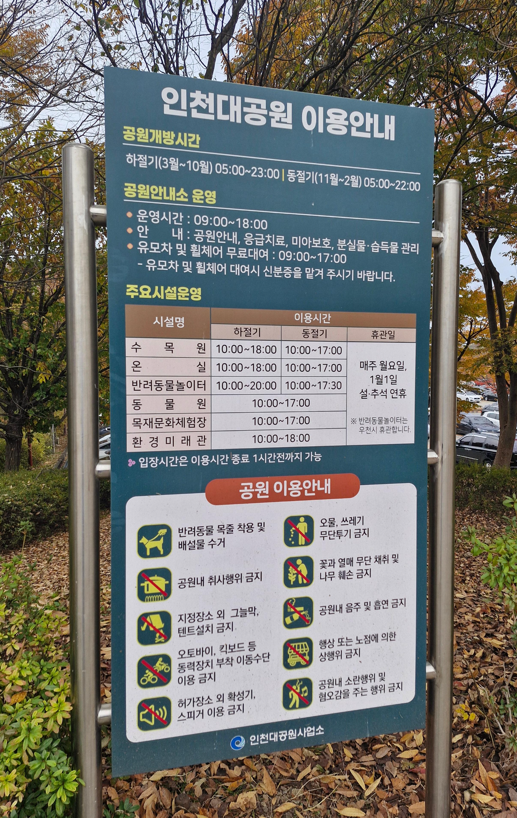 인천대공원은 총면적이 2,665,000㎡(약 80만 평) 규모의 대단히 큰 공원으로 연간 400만 명 이상의 사람들이